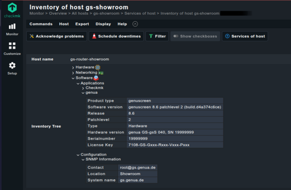 - das Inventory in Checkmk enthält detaillierte Informationen zu den genua Produkten, wie Produkt Typ, Software Version, Appliance Revision, Lizenzschlüssel und Hardware Seriennummer